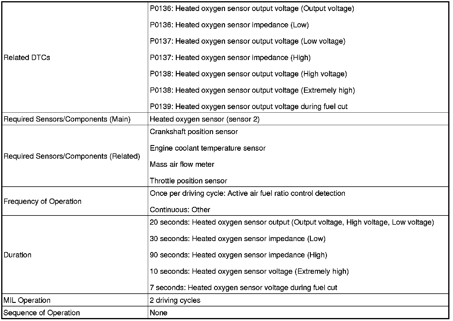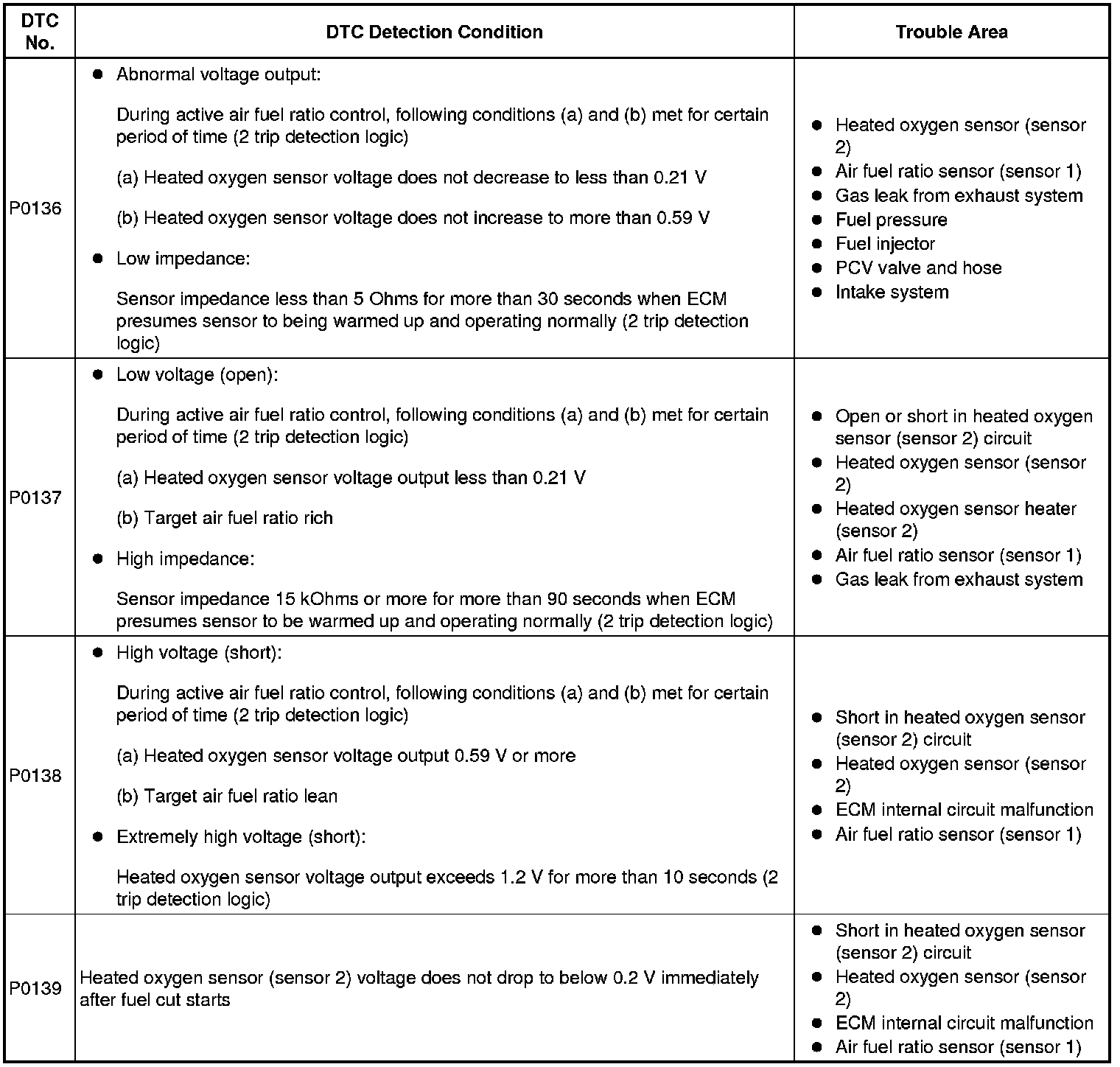 While the ECM is performing active air fuel ratio control, the air fuel ratio is forcibly regulated to become rich or lean. If the sensor is not functioning properly, the voltage output variation is small. For example, when the heated oxygen sensor voltage does not decrease to less than 0.21 V and does not increase to more than 0.59 V during active air fuel ratio control, the ECM determines that the sensor voltage output is abnormal and sets DTCs P0136.