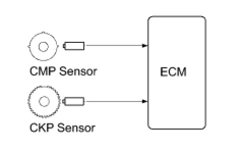 When the engine misfires, high concentrations of hydrocarbons (HC) enter the exhaust gas. High HC concentration levels can cause an increase in exhaust emission levels. Extremely high concentrations of HC can also cause increases in the three-way catalytic converter temperature, which may cause damage to the three-way catalytic converter. To prevent this increase in emissions and to limit the possibility of thermal damage, the ECM monitors the misfire rate. When the temperature of the three-way catalytic converter reaches the point of thermal degradation, the ECM blinks the MIL. To monitor misfires, the ECM uses both the Camshaft Position (CMP) sensor and the Crankshaft Position (CKP) sensor. The camshaft position sensor is used to identify any misfiring cylinders and the crankshaft position sensor is used to measure variations in the crankshaft rotation speed. Misfires are counted when the crankshaft rotation speed variations exceed predetermined thresholds. If the misfire count exceeds the threshold levels, and could cause emission control system performance deterioration, the ECM illuminates the MIL and sets a DTC.