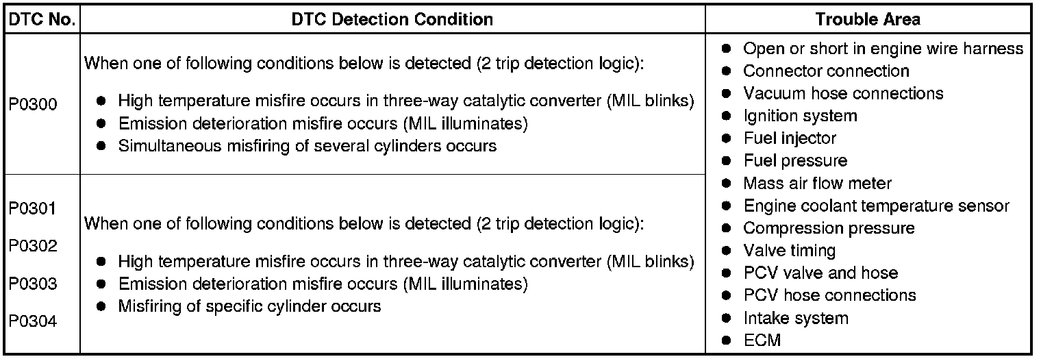 The ECM flashes the MIL and sets a DTC when either one of the following conditions, which could cause the three-way catalytic converter damage, is detected (2 trip detection logic).