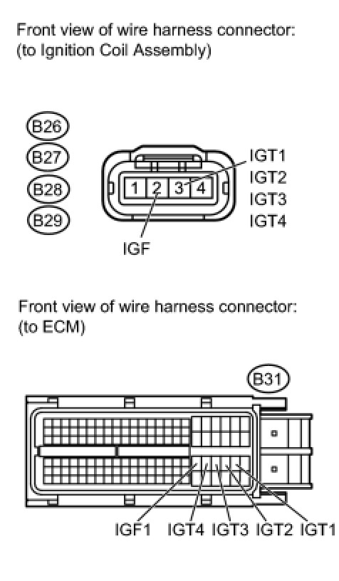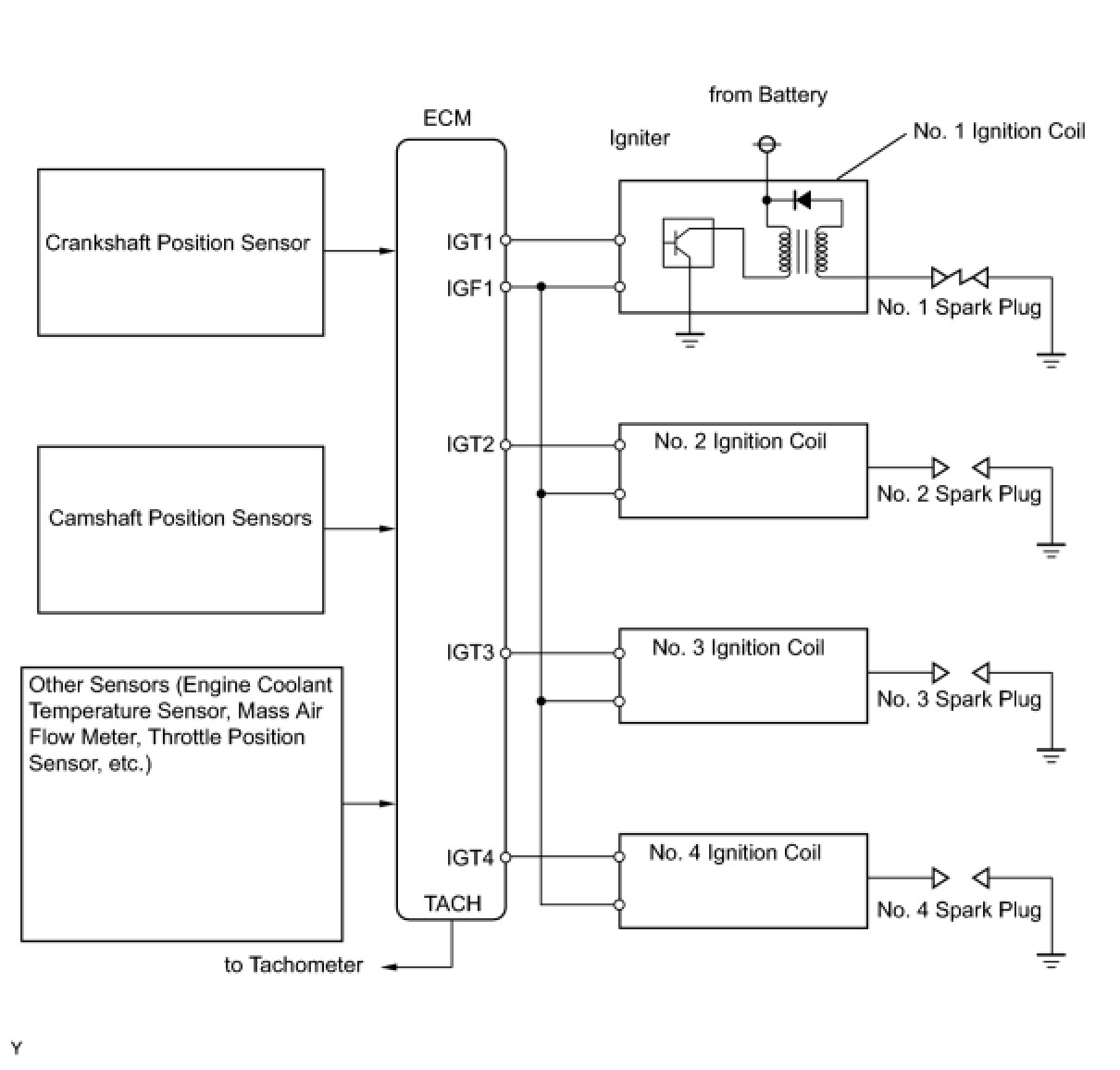 The ECM determines the ignition timing and transmits the ignition (IGT) signals to each cylinder. Using the IGT signal, the ECM turns the power transistor inside the igniter on and off. The power transistor, in turn, switches on and off the current to the primary coil. When the current to the primary coil is cut off, a powerful voltage is generated in the secondary coil. This voltage is applied to the spark plugs, causing them to spark inside the cylinders. As the ECM cuts the current to the primary coil, the igniter sends back an ignition confirmation (IGF) signal to the ECM, for each cylinder ignition.