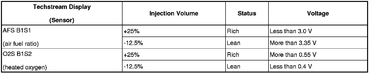 Lean: During Control the Injection Volume for A/F sensor, the air fuel ratio sensor output voltage (AFS) is consistently more than 3.35 V, and the heated oxygen sensor output voltage (O2S) is consistently less than 0.4 V.