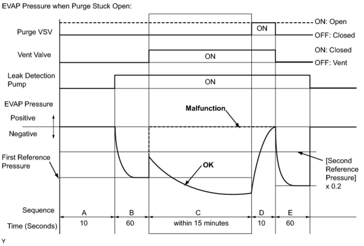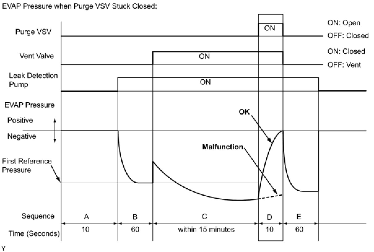 In operation D, the canister pressure sensor measures the EVAP system pressure. The pressure measurement for the purge VSV monitor is begun when the purge VSV is turned ON (open) after the EVAP leak check. When the measured pressure indicates an increase of 0.3 kPa-g (2.25 mmHg-g) or more, the purge VSV is functioning normally. If the pressure does not increase, the ECM interprets this as the purge VSV being stuck closed. The ECM illuminates the MIL and sets the DTC (2 trip detection logic).