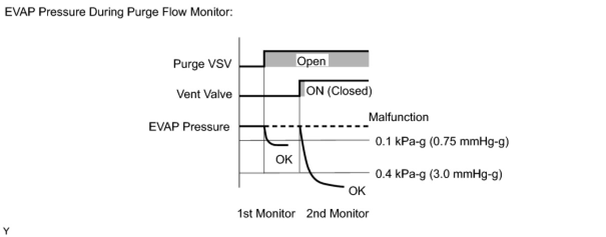 While the engine is running and the purge VSV is ON (open), the ECM monitors the purge flow by measuring the EVAP pressure change. If negative pressure is not created, the ECM begins the 2nd monitor.