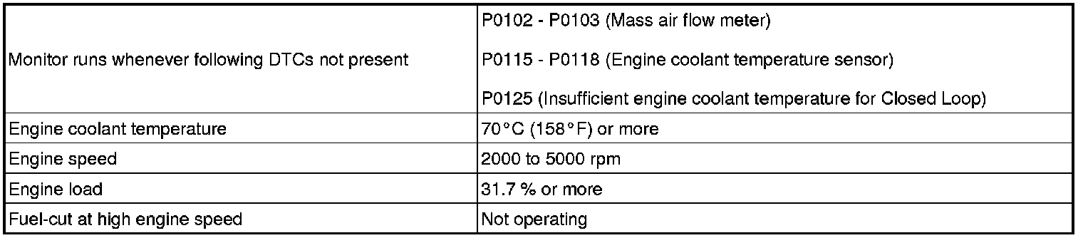 The ECM assumes that the vehicle is being driven when the indicated engine speed is more than 2000 rpm and the engine load calculated by the ECM is more than a certain level or the idle fuel-cut operation* is being executed. If there is no signal from the vehicle speed sensor, despite these conditions being met, the ECM interprets this as a malfunction in the speed signal circuit. The ECM then illuminates the MIL and sets the DTC.