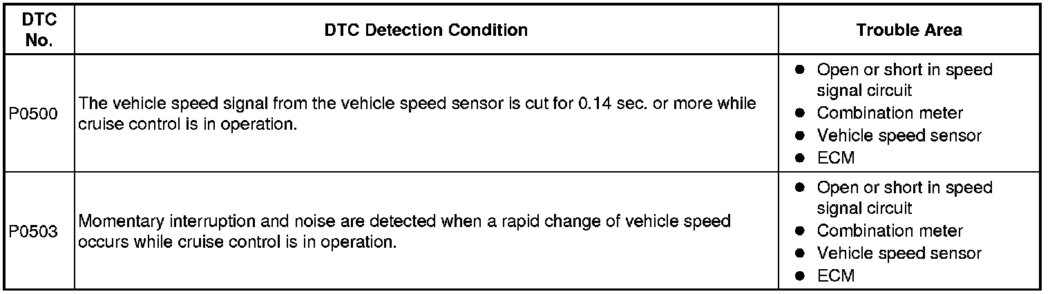 The cruise control system uses the same vehicle speed signal that is sent to the ECM for the SFI system. If DTC P0500 or P0503 is detected, perform the diagnosis using the inspection procedure for DTC P0500 in the SFI system P0500for 2ZR-FE, or P0500 for 2AZ-FE). The speed signal is converted for use by the cruise control system inside the ECM. Both the SFI system and the cruise control system can set DTC P0500, however, the detection conditions of the two systems are different.
