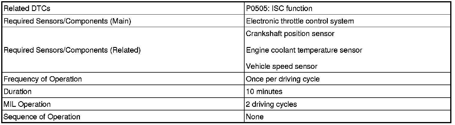 The ECM monitors the idle speed and idle air flow volume to conduct Idle Speed Control (ISC). The ECM determines that the idle speed control system is malfunctioning if the following conditions apply: