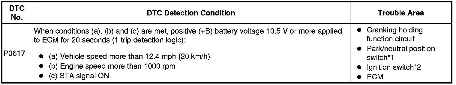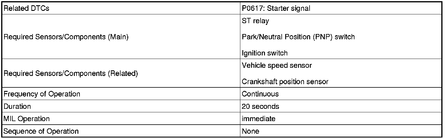 If the ECM detects the starter signal (STA signal) while the vehicle is being driven, it determines that there is a malfunction in the STA circuit. The ECM then illuminates the MIL and sets the DTC.