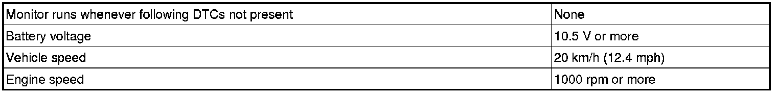 This monitor runs when the vehicle is driven at 12.4 mph (20 km/h) for over 20 seconds.