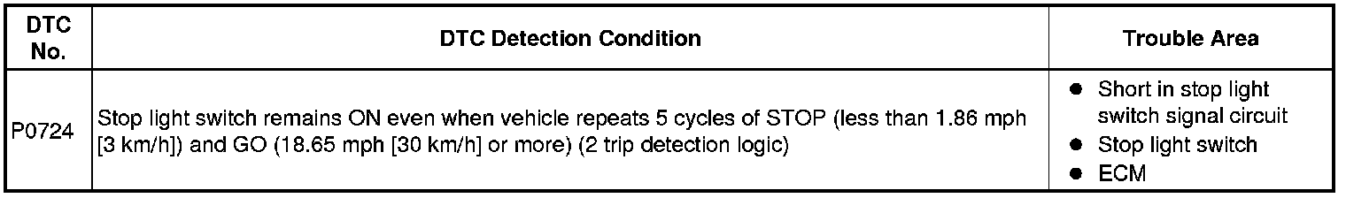 This DTC indicates that the stop light switch remains ON. When the stop light switch remains ON during "stop and go" driving, the ECM interprets this as a fault in the stop light switch and the MIL comes on and the ECM stores the DTC. The vehicle must stop (less than 1.86 mph [3 km/h]) and go (18.65 mph [30 km/h] or more) 5 times during 2 driving cycles, in order to detect a malfunction.