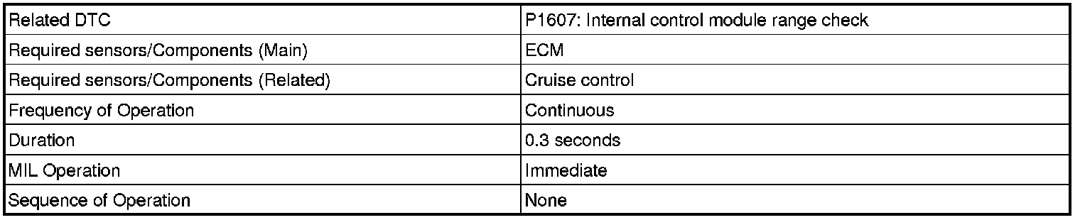 The ECM continuously monitors its main and sub CPUs for the cruise control. This self-check ensures that the ECM is functioning properly. If outputs from the CPUs are different and deviate from the standards, the ECM will illuminate the MIL and set the DTC immediately.