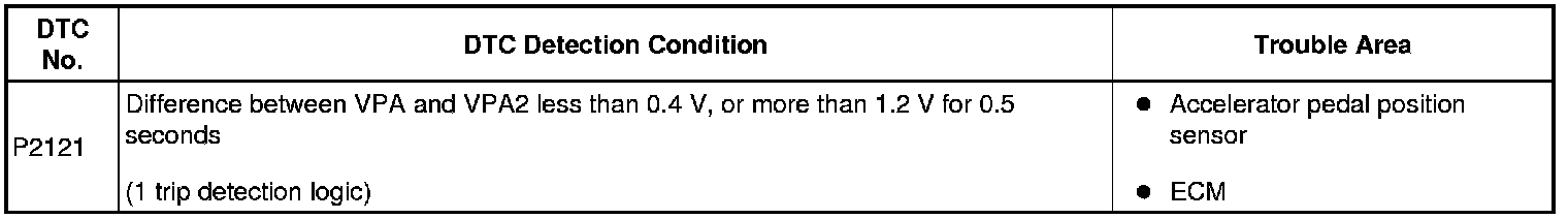 The accelerator pedal position sensor is mounted on the accelerator pedal bracket. The accelerator pedal position sensor has 2 sensor elements and 2 signal outputs: VPA and VPA2. VPA is used to detect the actual accelerator pedal angle (used for engine control) and VPA2 is used to detect malfunctions in VPA. When the difference between the output voltages of VPA and VPA2 deviates from the standard, the ECM determines that the accelerator pedal position sensor is malfunctioning. The ECM turns on the MIL and the DTC is set.