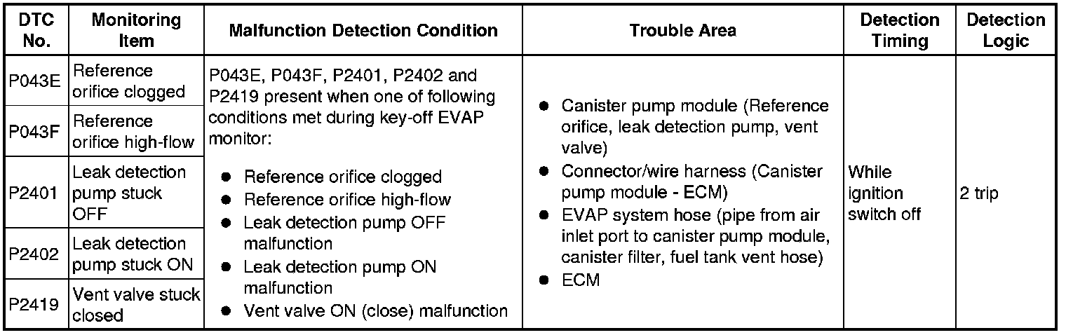 If any EVAP system DTCs are set, the malfunctioning area can be determined using the table below.