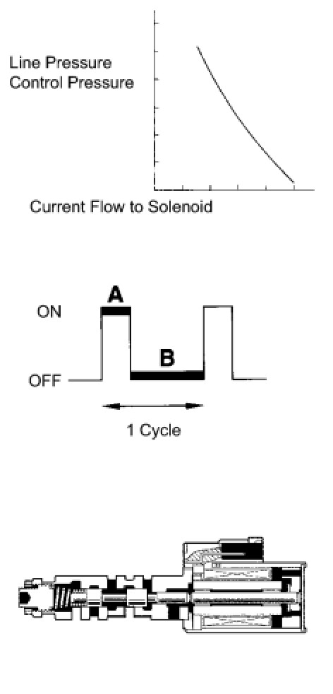 The shift solenoid valve SLT controls the transmission line pressure for smooth transmission operation based on signals from the throttle position sensor and the vehicle speed sensor. The ECM adjusts the duty ratio (*) of the shift solenoid valve SLT to control hydraulic line pressure coming from the primary regulator valve. Appropriate line pressure assures smooth shifting with varying engine outputs.