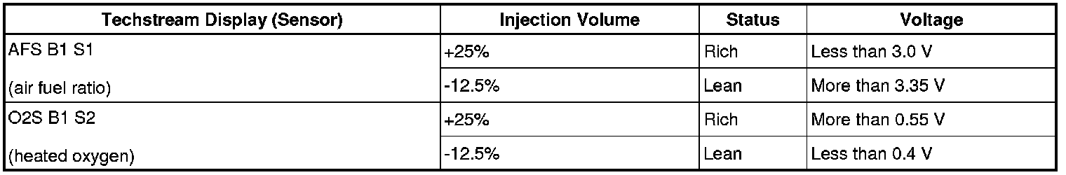 HINT: Malfunctioning areas can be identified by performing the Control the Injection Volume for A/F sensor function provided in the Active Test. The Control the Injection Volume for A/F sensor function can help to determine whether the air fuel ratio sensor, heated oxygen sensor and other potential trouble areas are malfunctioning.