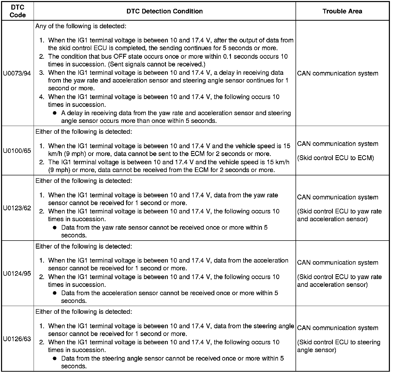 HINT: The CAN communication system must be normal when performing troubleshooting for each sensor DTC (for ABS and VSC).