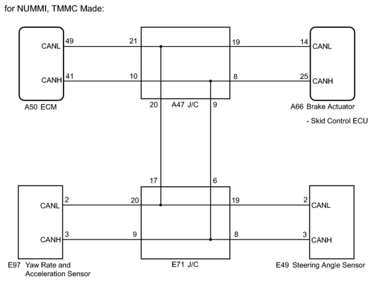 The skid control ECU receives signals from the ECM, steering angle sensor, and yaw rate and acceleration sensor via the CAN communication system.
