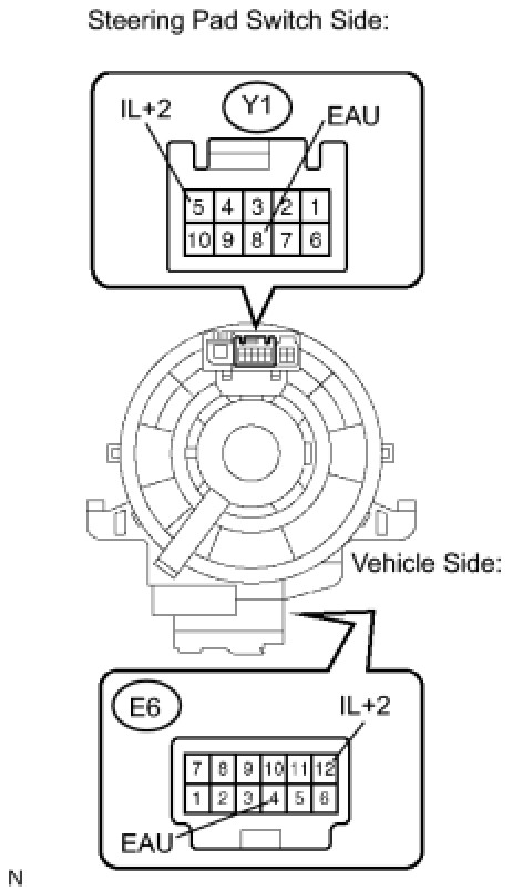 (b) Connect a positive (+) lead to terminal IL+2 and a negative (-) lead to terminal EAU of the steering pad switch connector.