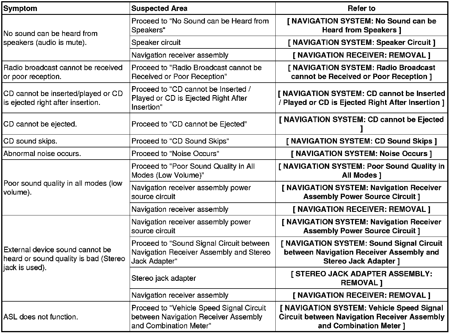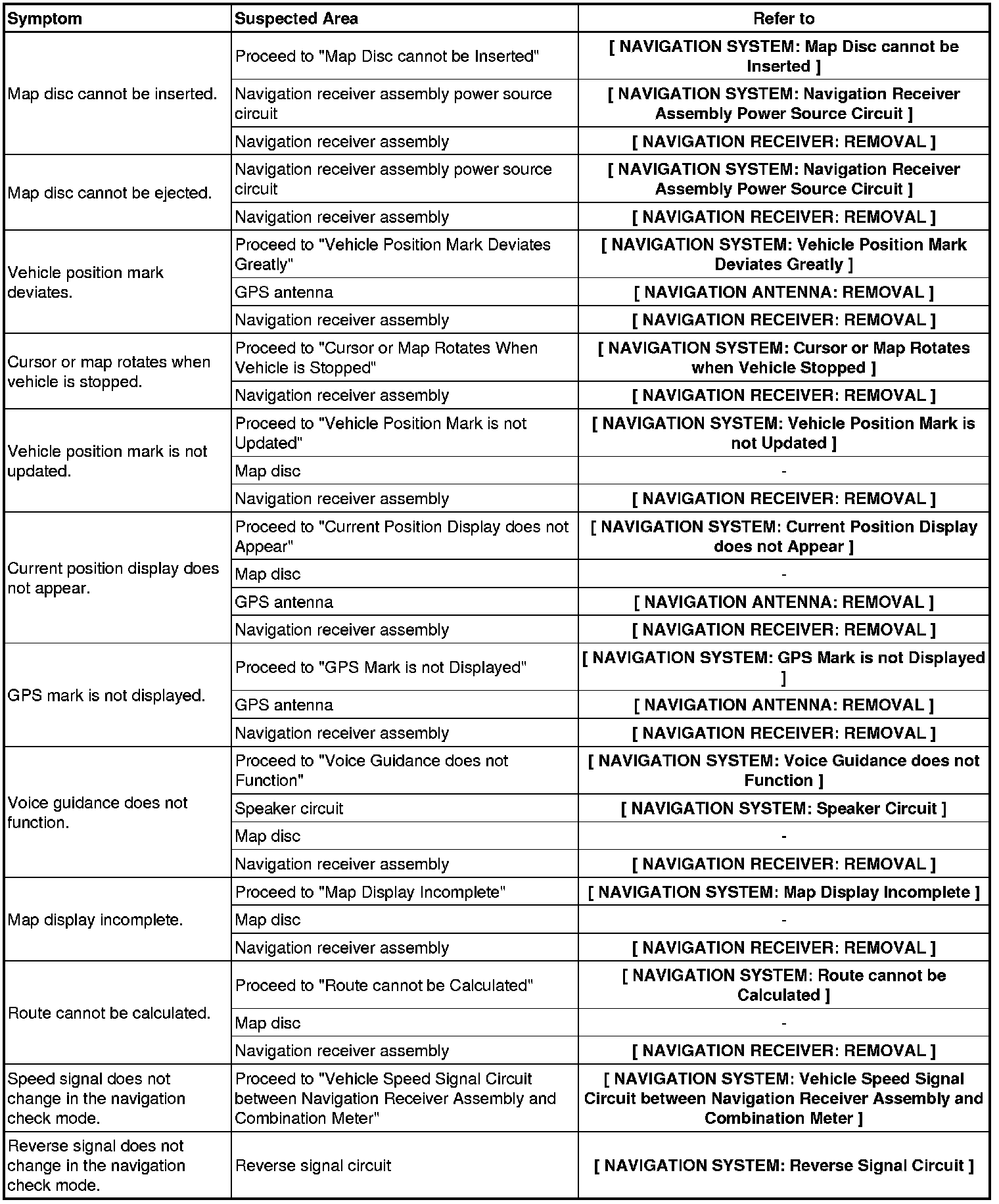NAVIGATION / MULTI INFO DISPLAY: NAVIGATION SYSTEM: PROBLEM SYMPTOMS TABLE