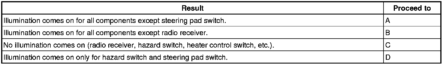 (a) Check if the illumination for the radio receiver, steering pad switch, heater control switch or others (hazard switch, transmission control switch, etc.) comes on when the light control switch is turned to the HEAD or TAIL position.