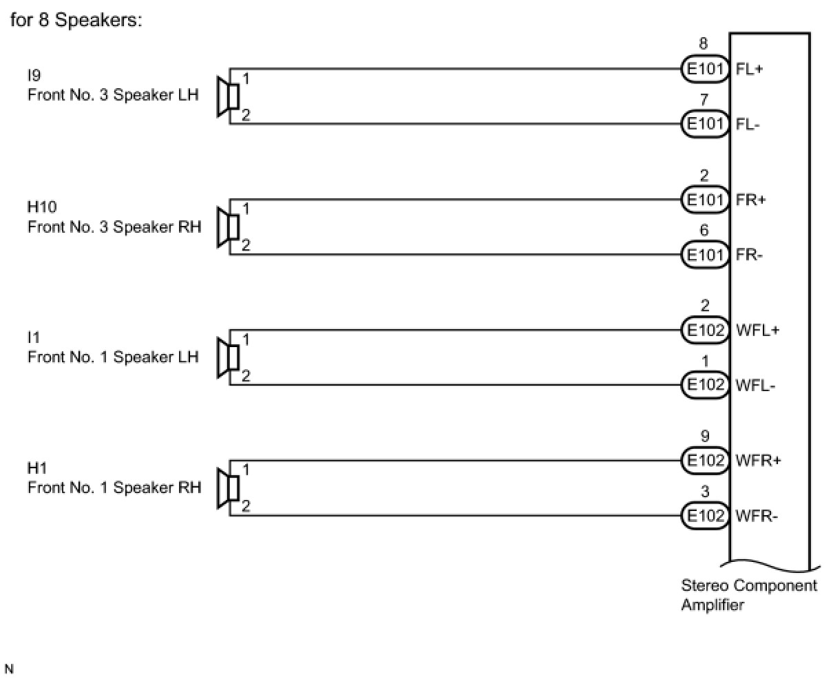 Measure the resistance between each of the front No. 1 speakers and the stereo component amplifier to check for an open circuit in the wire harness.