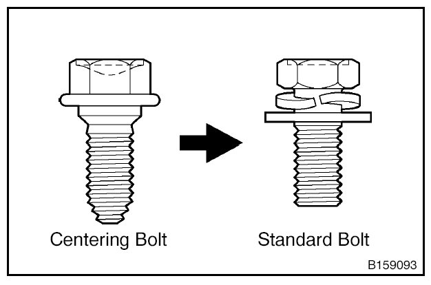 HINT: Centering bolts are used to mount the hood hinge and hood lock. The hood and hood lock cannot be adjusted with the centering bolts installed. Substitute the centering bolts with standard bolts (with washers) when making adjustments.