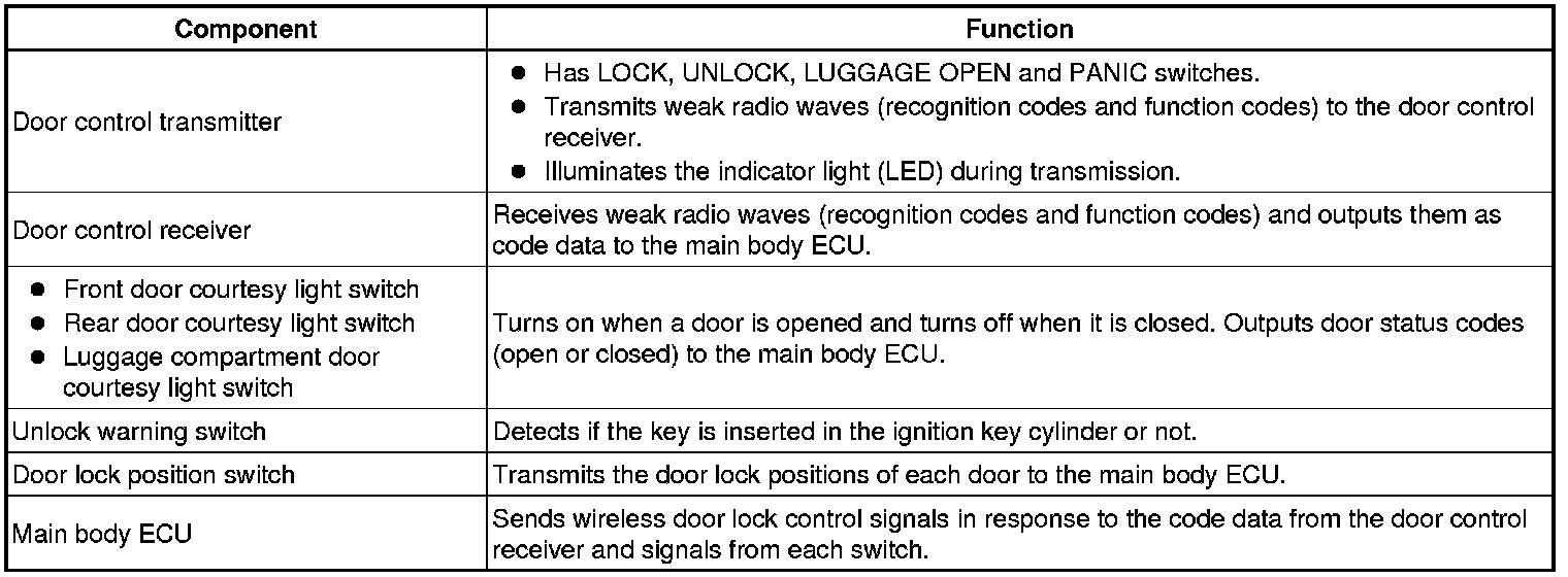 The wireless door lock control system functions to lock and unlock all the doors from a distance. The system is controlled by a hand-held transmitter which sends radio waves to the door control receiver. The main body ECU performs an ID code identification process and engages the door lock.