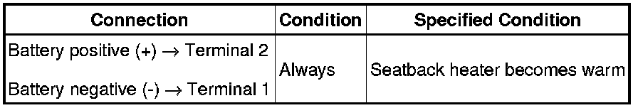 NOTE: Immediately after confirming that the seat heater is functioning normally, remove the battery leads. Failing to do so may cause the seat heater to overheat.