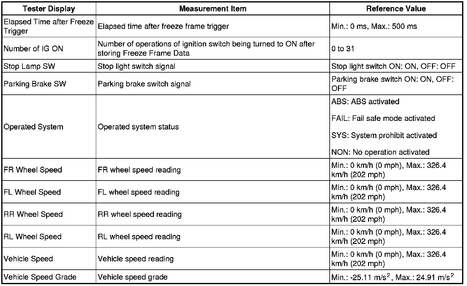 - Freeze Frame Data at the time the ABS operates: