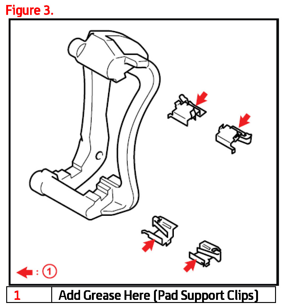 5. Add disc brake caliper grease to both sides of the pad support clips and the anti-squeal shims.
