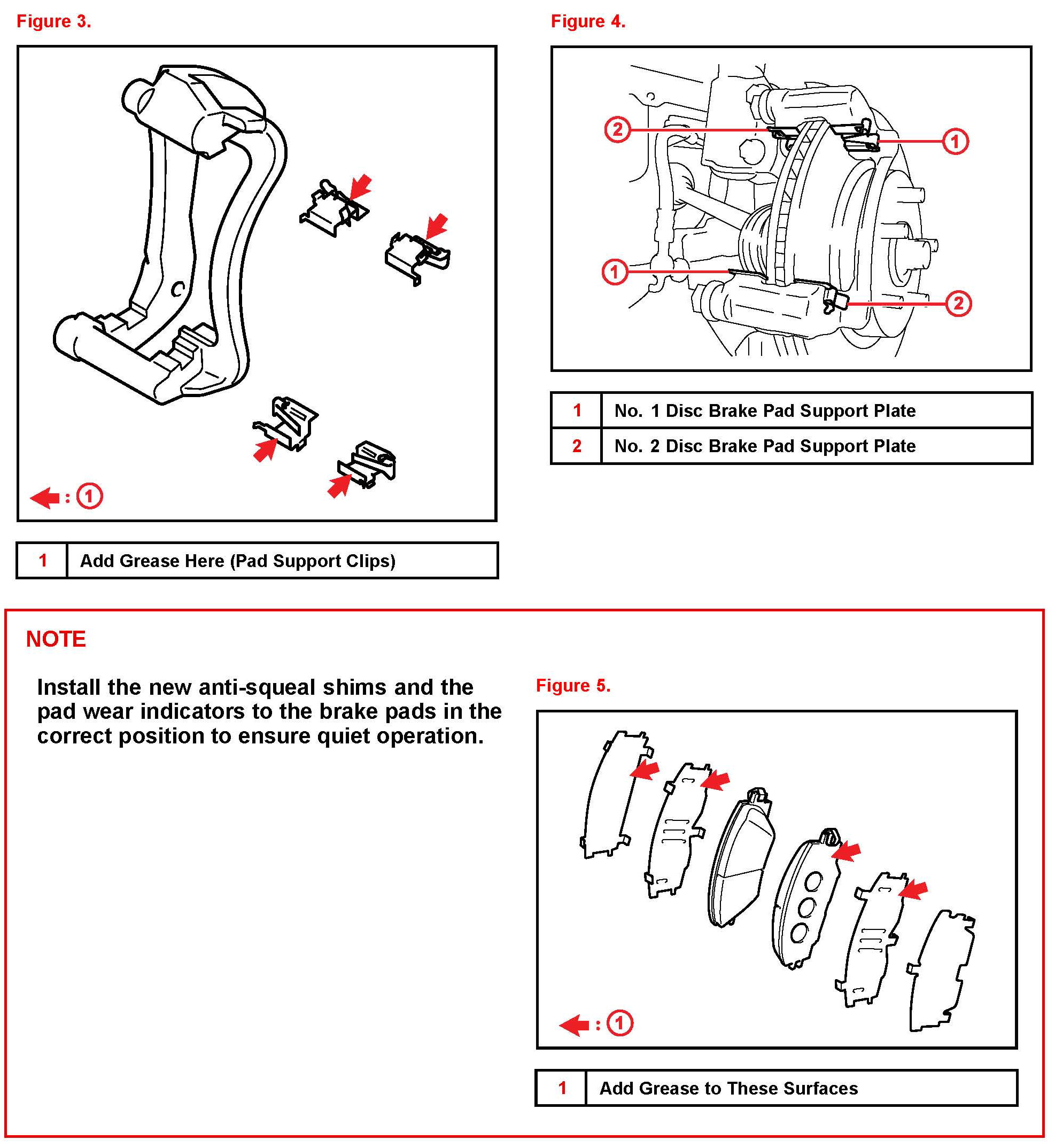5. Add disc brake caliper grease to both sides of the pad support clips and the anti-squeal shims.