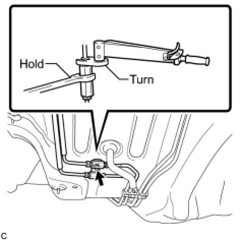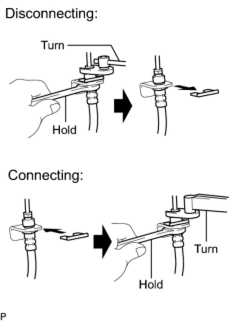 1. Hold the flexible hose with a wrench and disconnect the brake line with a union nut wrench without deforming the line.
