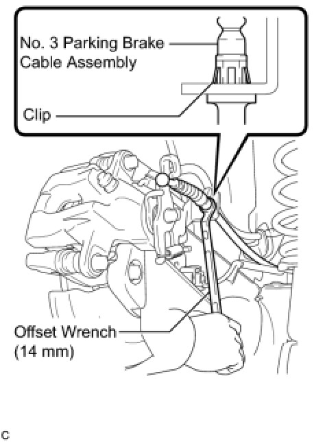 HINT: Insert an offset wrench (14 mm) at the base of the No. 3 parking brake cable assembly as shown in the illustration to disengage the clip. Pull out the No. 3 parking brake cable assembly from the rear disc brake cylinder assembly.
