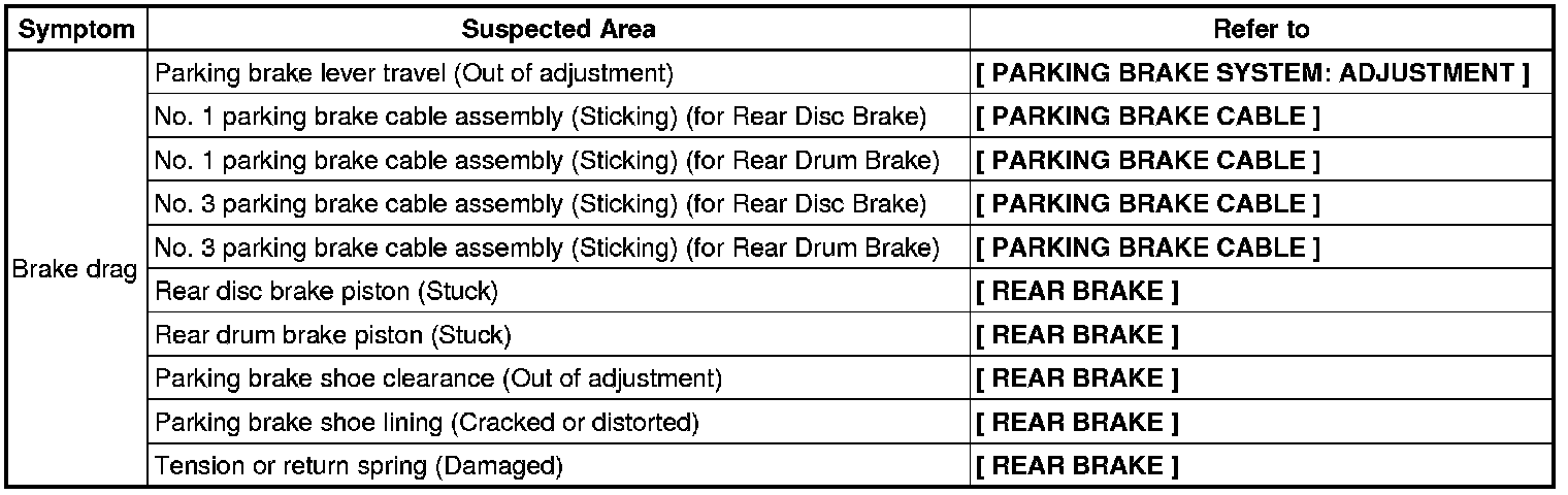 PARKING BRAKE: PARKING BRAKE SYSTEM: PROBLEM SYMPTOMS TABLE