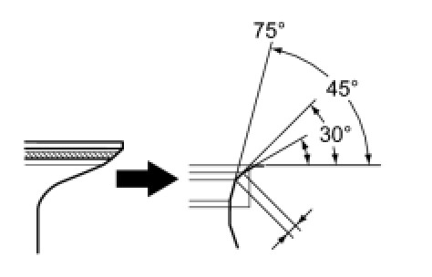 (b) Using 30° and 75° cutters, correct the valve seat so that the valve contacts the entire circumference of the seat. The contact should be in the center of the valve seat, and the valve seat width should be maintained within the specified range around the entire circumference of the seat.