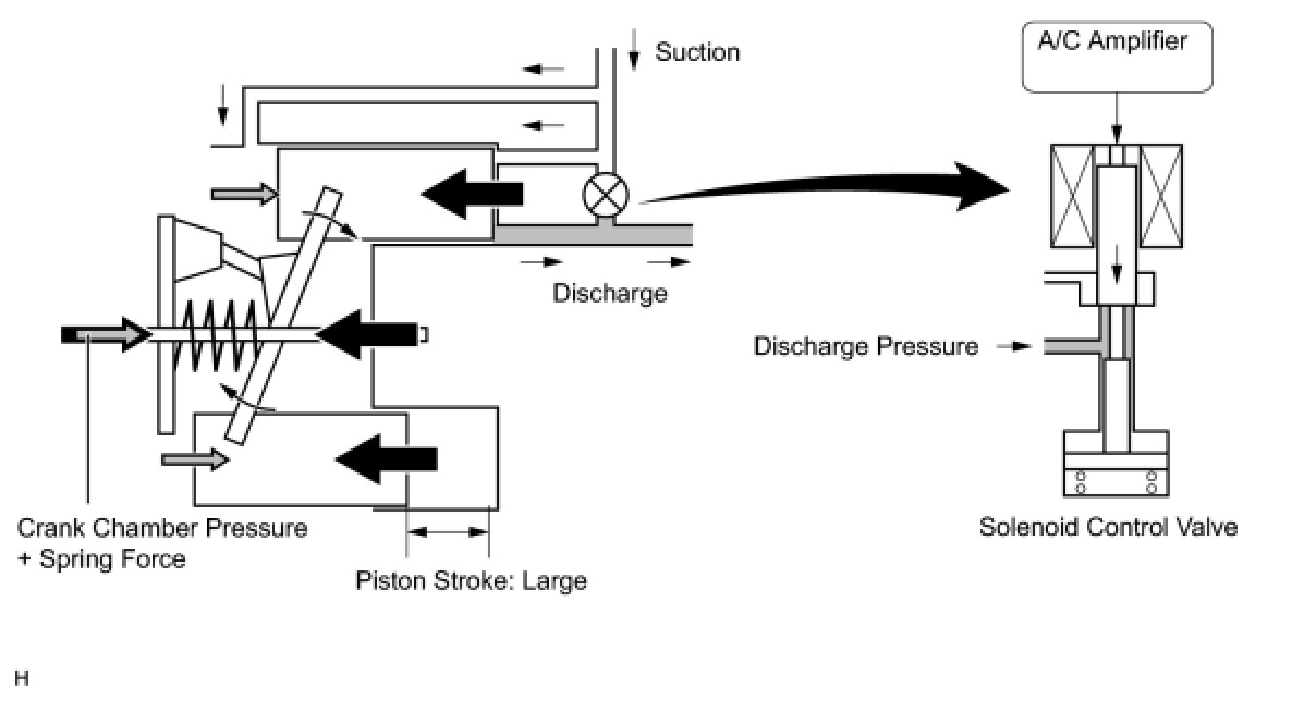 (3) When the solenoid control valve closes (solenoid coil is energized), a difference in pressure is created and the pressure in the crank chamber decreases. Then, the pressure that is applied to the right side of the piston becomes greater than the pressure that is applied to the left side of the piston. This compresses the spring and tilts the lug plate. As a result, there is a large piston stroke and the discharge capacity increases.