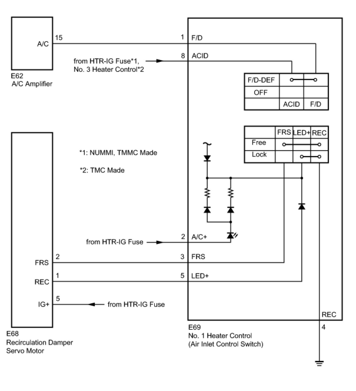The recirculation damper servo motor and No. 1 heater control (air inlet control switch) are powered through the HTR-IG fuse. Operating the No. 1 heater control (air inlet control switch) drives the recirculation damper servo motor to switch between "FRESH" and "RECIRCULATION".