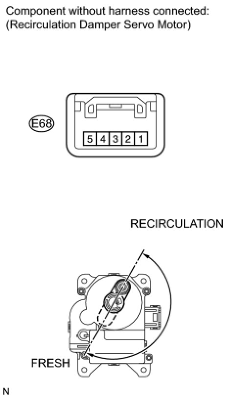 (d) Connect a positive (+) lead from the battery to terminal 5 and a negative (-) lead from the battery to terminal 1, then check that the arm turns to the "RECIRCULATION" side smoothly.