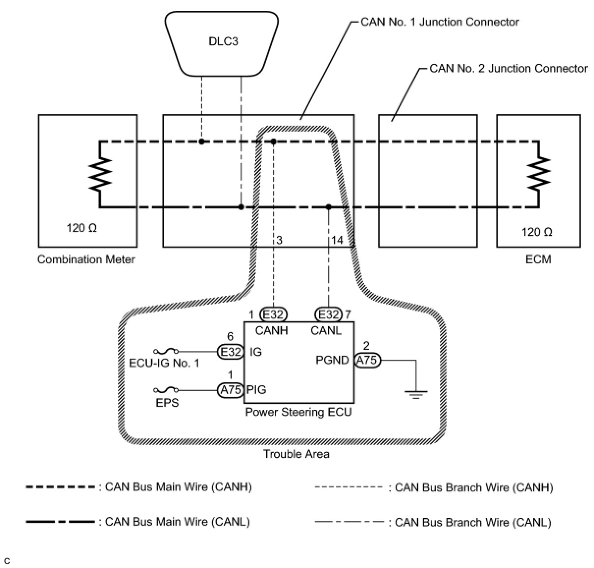 1. CHECK CAN BUS WIRE FOR DISCONNECTION (POWER STEERING ECU BRANCH WIRE)