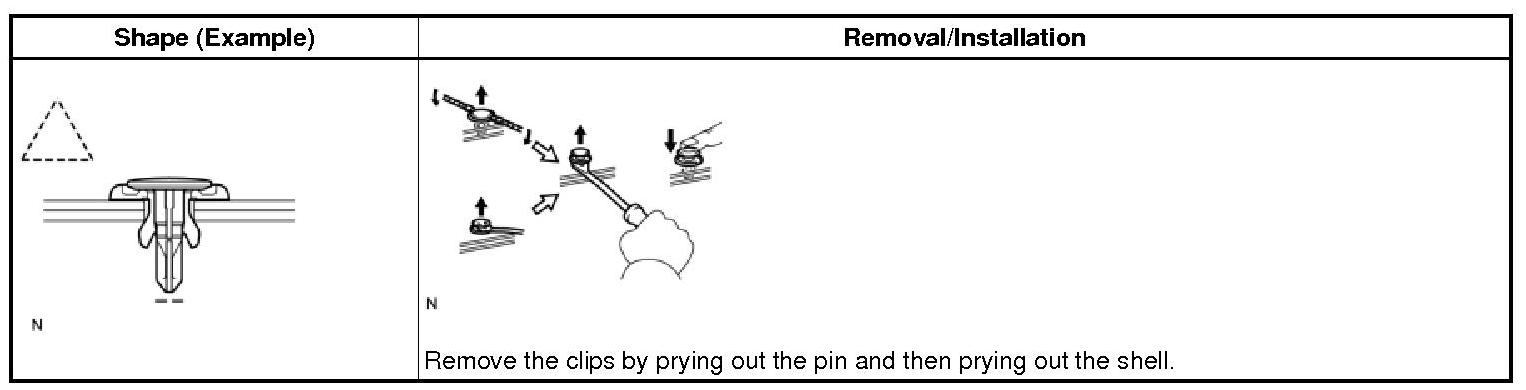 (1) The removal and installation methods of typical clips used for vehicle body parts are shown in the table below.