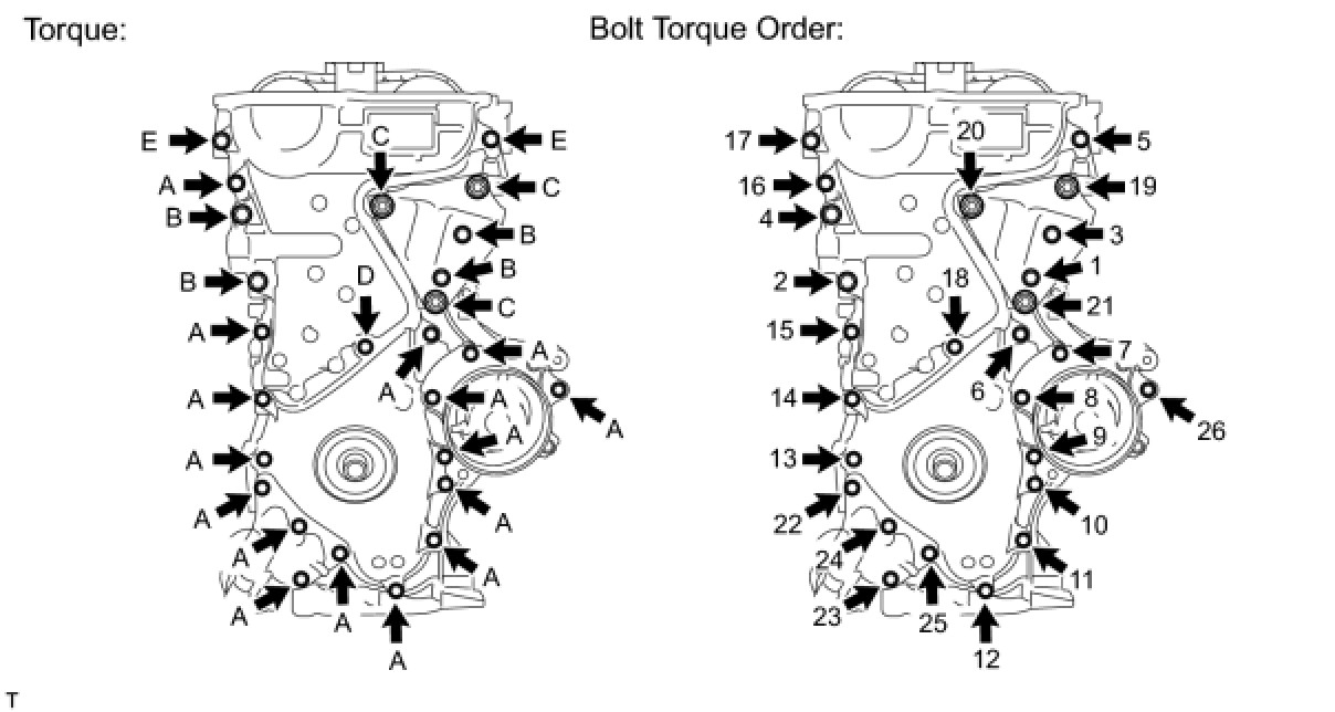 Fully tighten the timing chain cover sub-assembly with the 26 bolts as shown in the illustration.