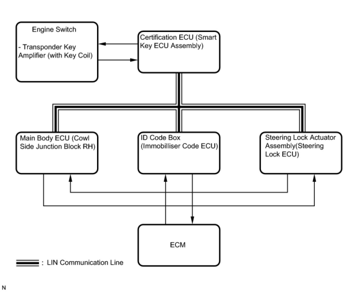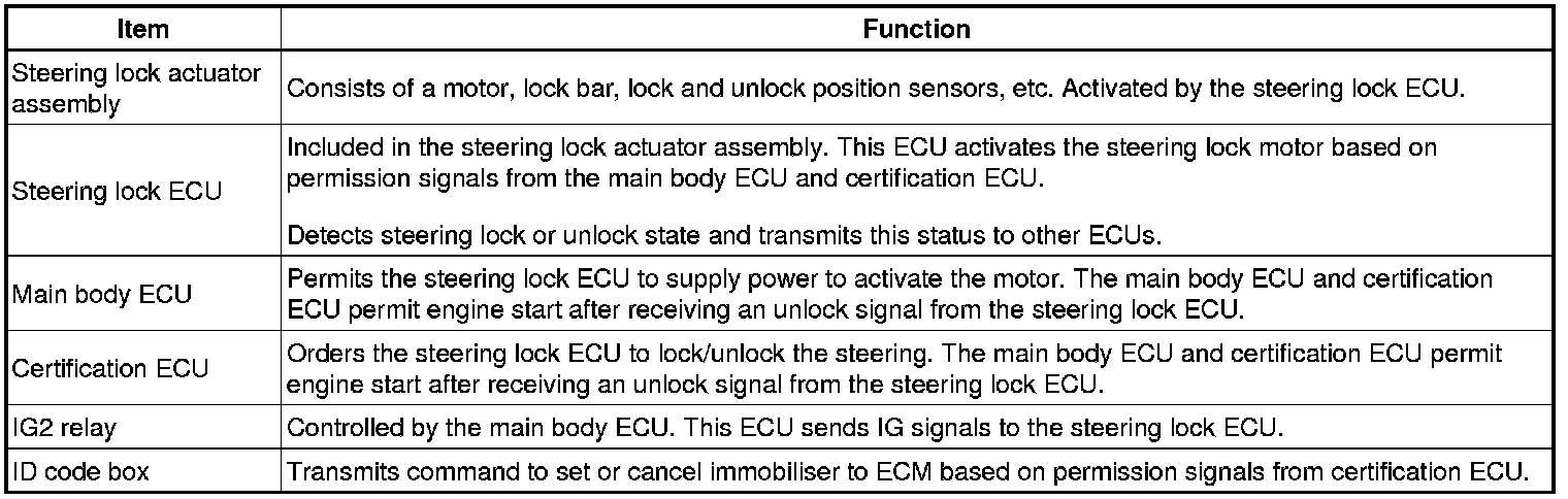 (a) The steering lock system locks or unlocks the steering by activating the steering lock actuator assembly. The steering lock ECU activates the motor that is built into the actuator assembly based on signals from the certification ECU and main body ECU.