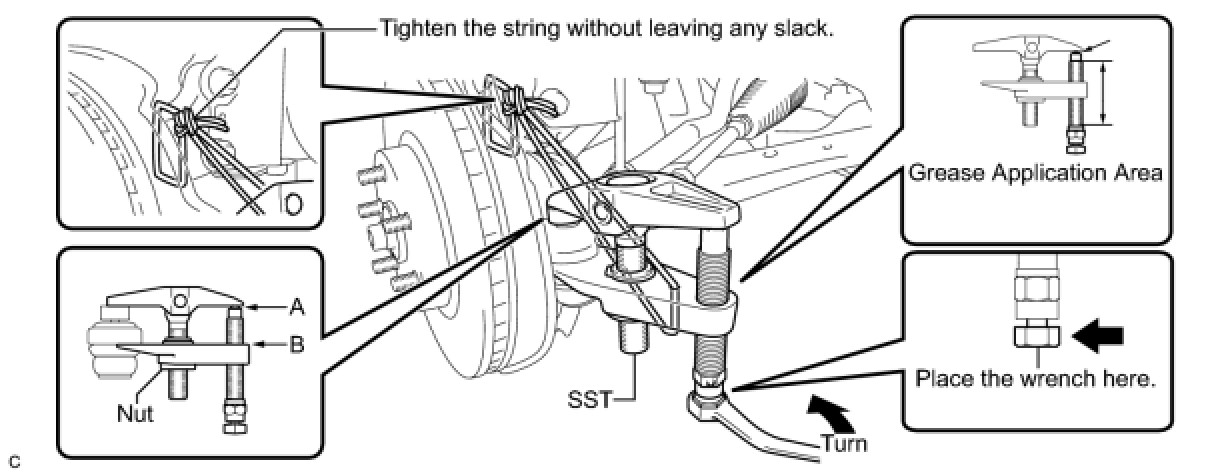 - Be sure to tighten the string firmly to secure SST to the steering knuckle to prevent SST from falling off.