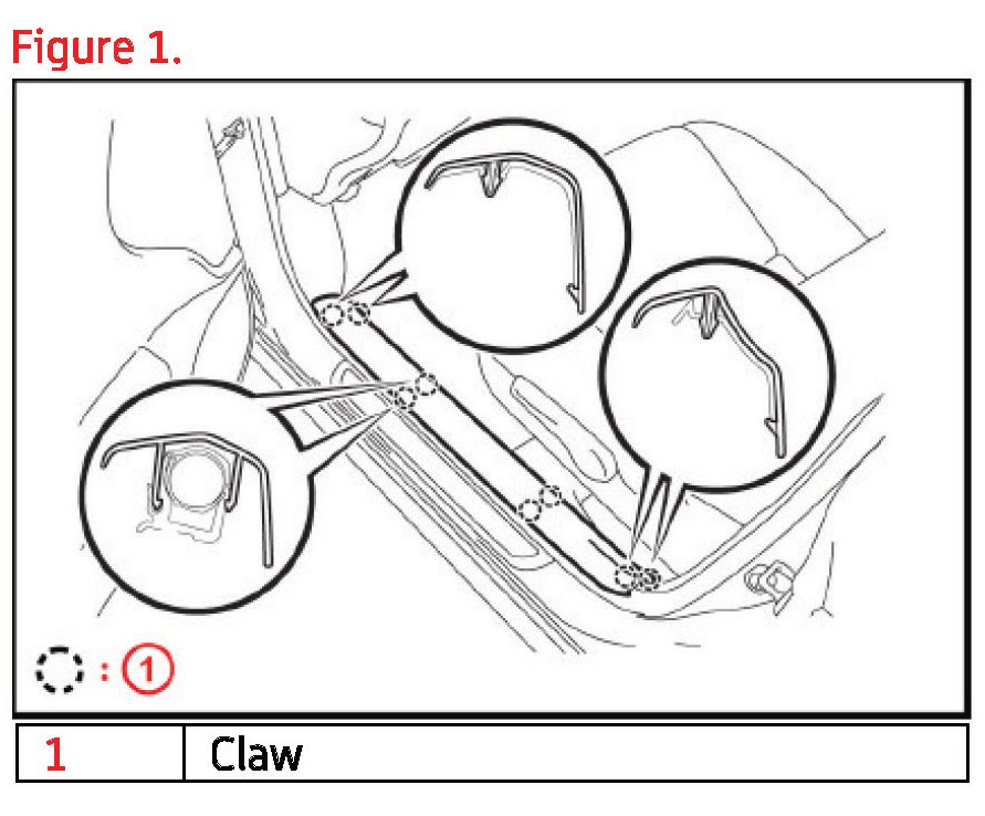 1. Remove the front door scuff plate by disengaging the 8 claws.
