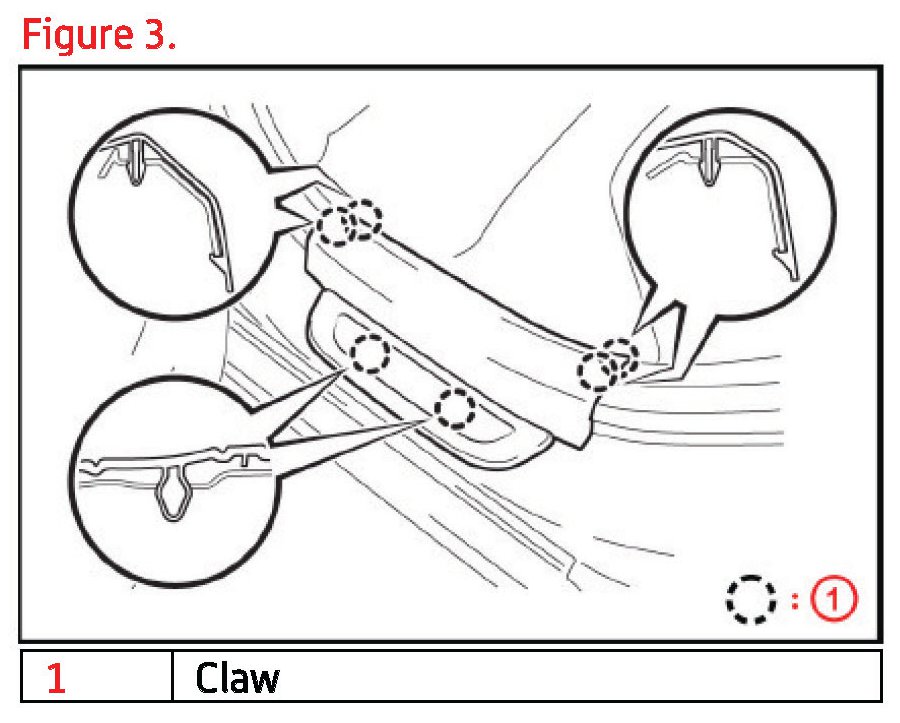 3. Remove the rear door scuff plate by disengaging the 6 claws.