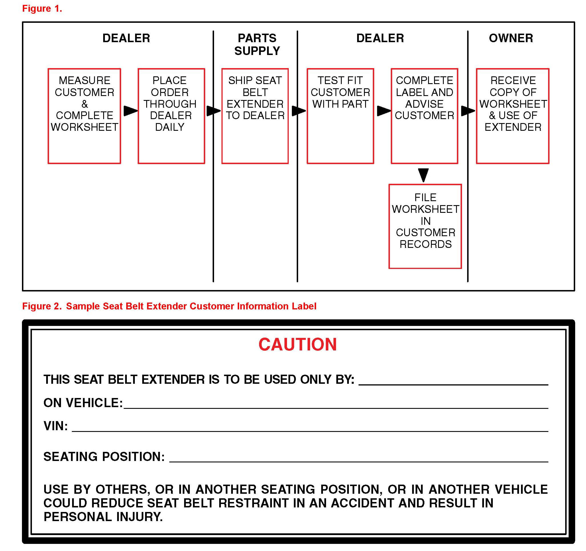The dealership service department should complete the affixed Seat Belt Extender Customer Information Label on the part and review the "Owner Instructions" with the customer. The dealership should give a copy of the completed worksheet and Owner Instructions to the customer and keep the originals in the customer's file. To assure utmost owner satisfaction, it is recommended that a dealership designate one person to coordinate all activities related to the Seat Belt Extender issue. It is recommended that dealerships do NOT stock Seat Belt Extenders due to the need for proper fitting to individual customers.