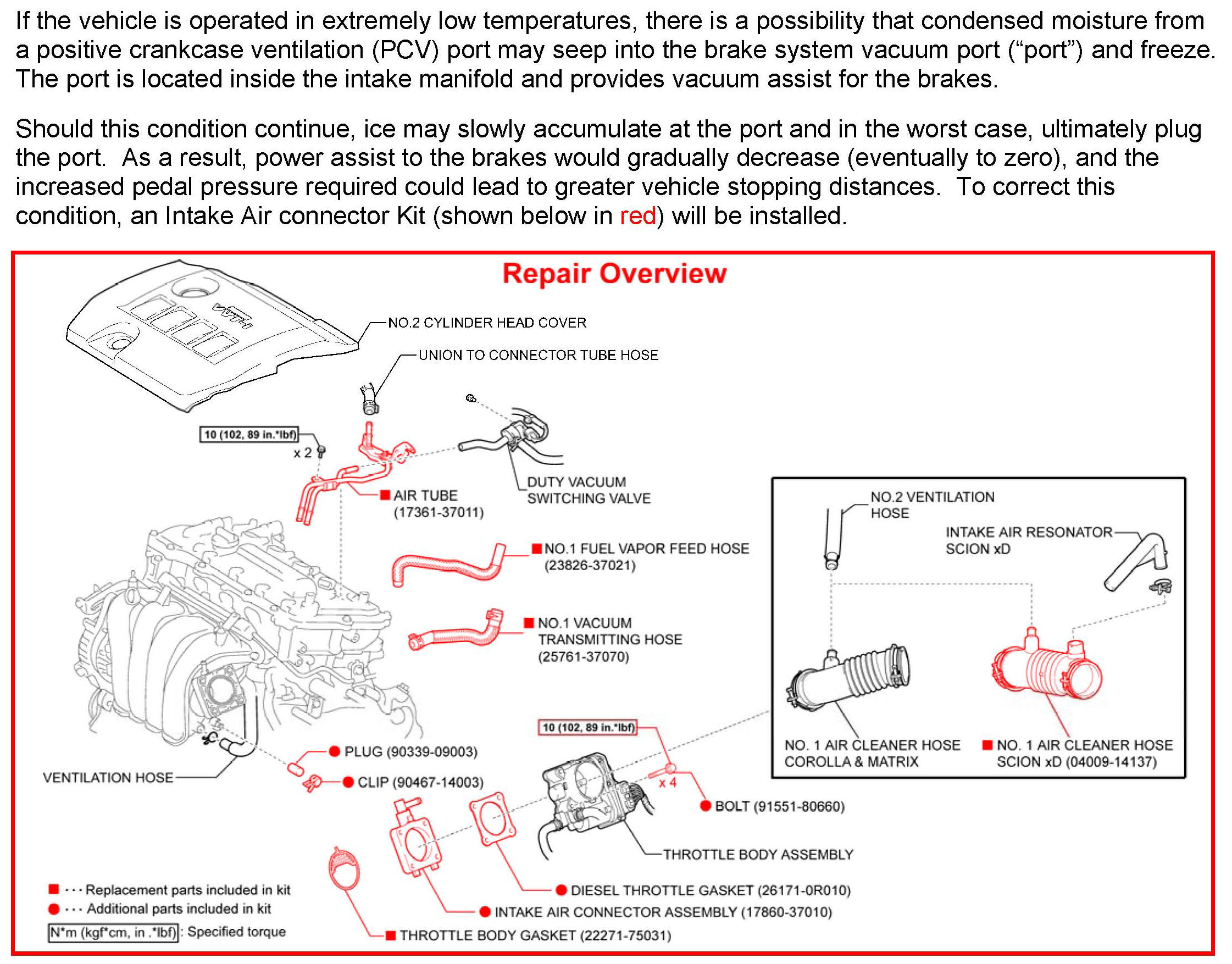 If the vehicle is operated in extremely low temperatures there is a possibility that condensed moisture from a positive crankcase ventilation (PCV) port may seep into the brake system vacuum port ("port") and freeze. The port is located inside the intake manifold and provides vacuum assist for the brakes.Should this condition continue, ice may slowly accumulate at the port and in the worst case, ultimately plug the port. As a result, power assist to the brakes would gradually decrease (eventually to zero), and the increased pedal pressure required could lead to greater vehicle stopping distances. To correct this condition, an Intake Air connector Kit (shown) will be installed.