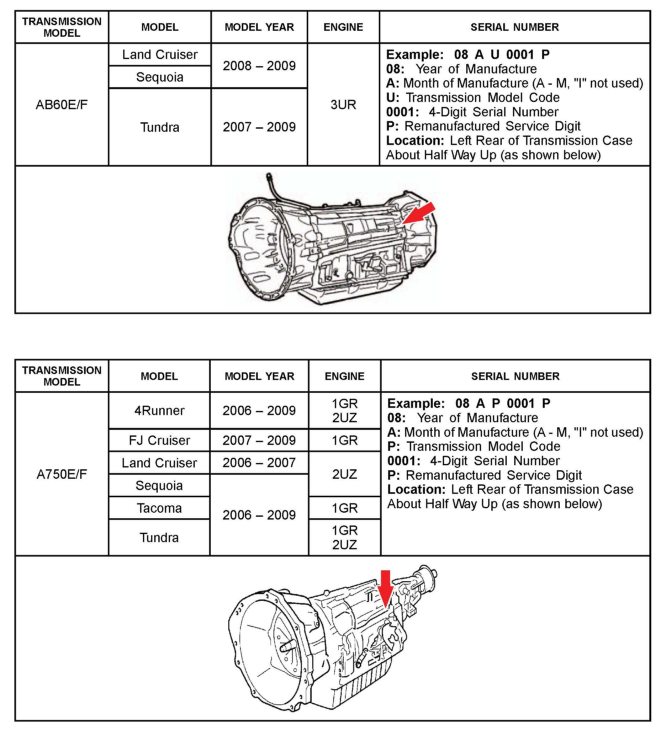 The purpose of this TSB is to assist in the identification and location of serial numbers on 2006 - 2009 model year remanufactured automatic transmissions.