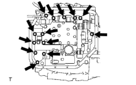 (d) Remove the 13 bolts and valve body assembly.