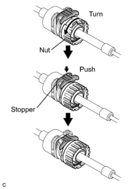 (a) Rotate the transmission control cable nut counterclockwise approximately 180° and, while holding the nut in that position, push in the stopper until it makes 2 "click" sounds.