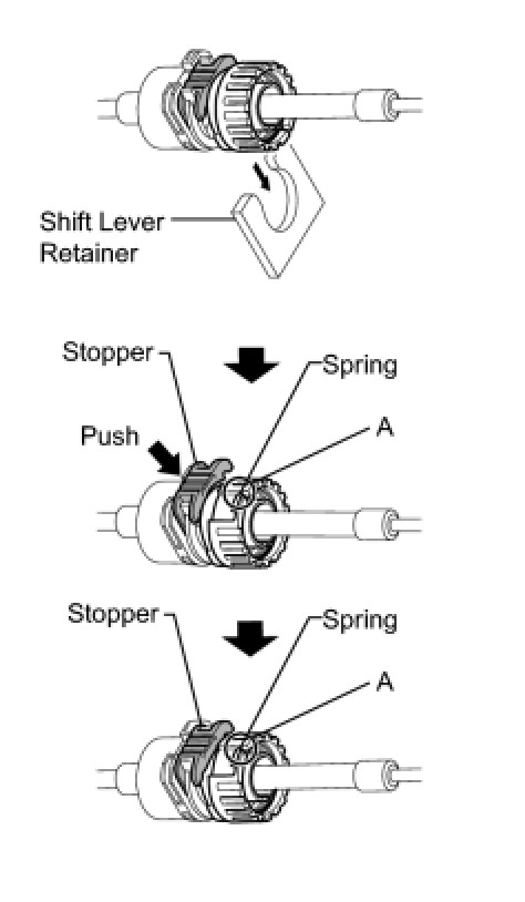 (b) Install the outer part of the transmission control cable to the shift lever retainer, check that the position of the spring is the same as A shown in the illustration, and push in the stopper.